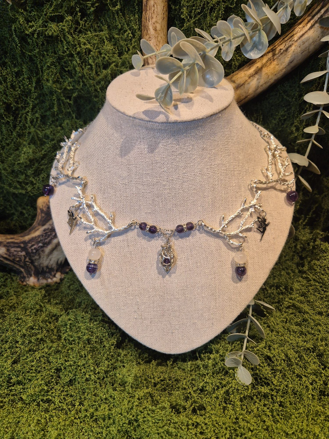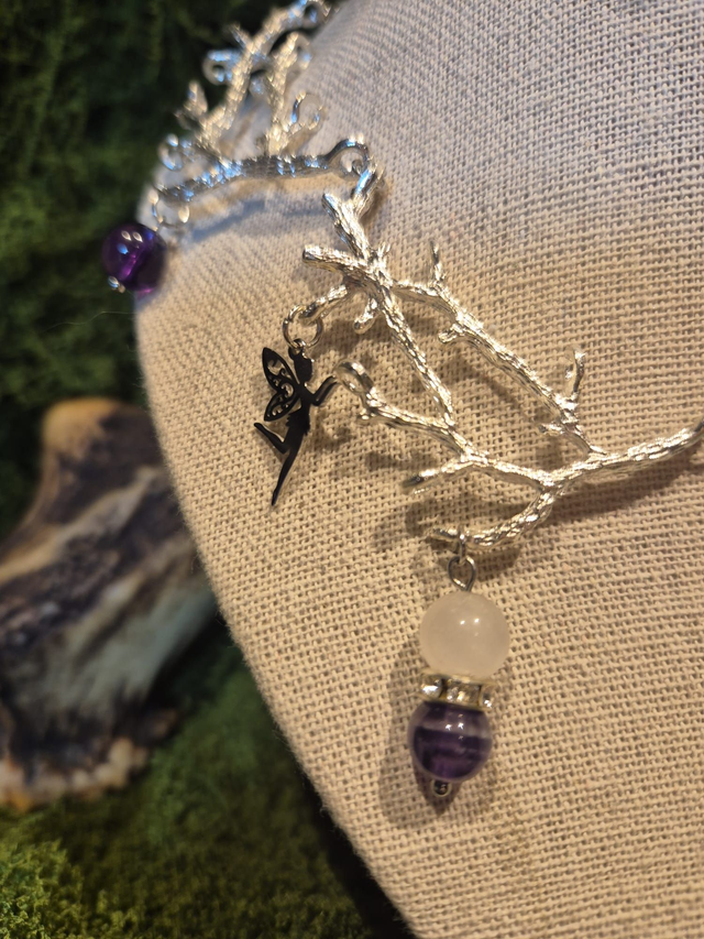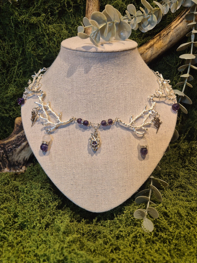 Son pendentif central, serti d’une améthyste violette, est enlacé de branches argentées aux formes organiques, comme façonnées par les esprits de la forêt.