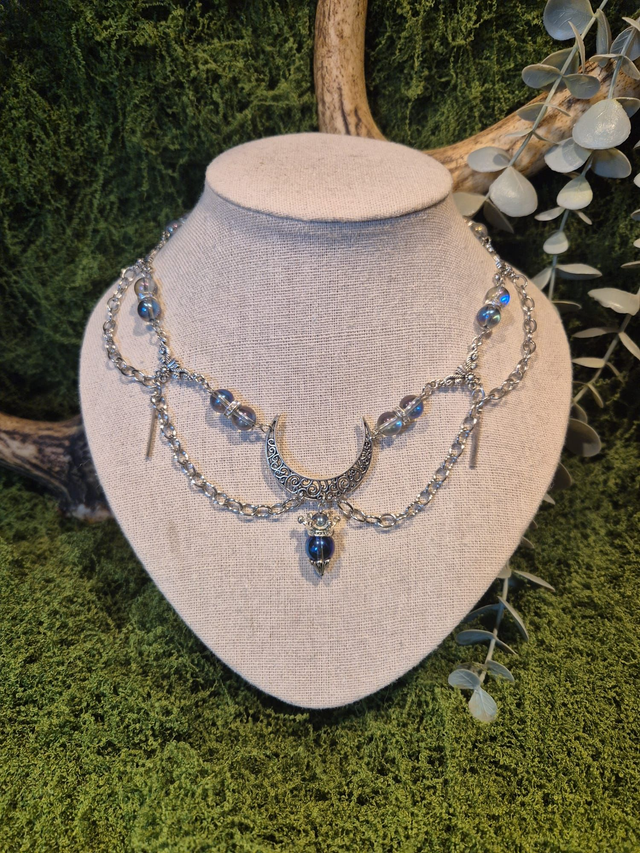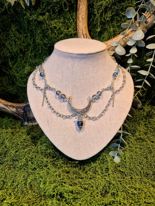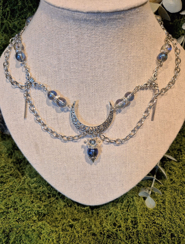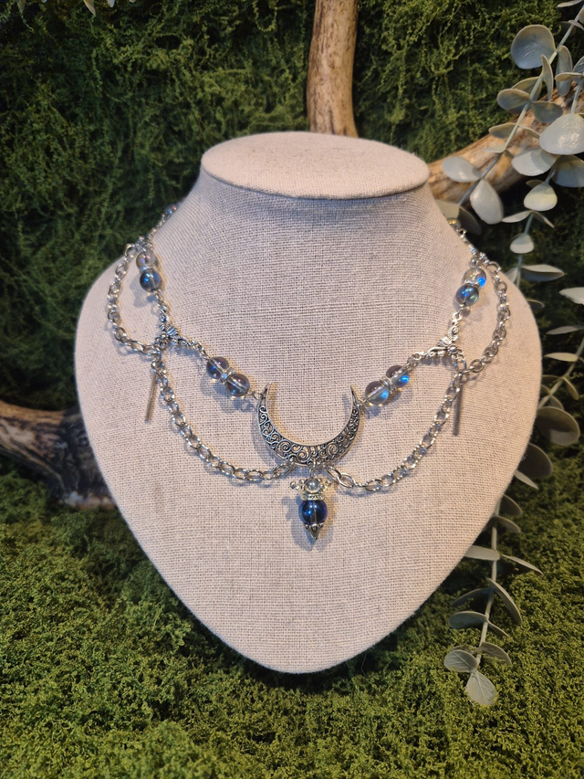 Son pendentif central, une lune argentée finement ouvragée, accueille une perles orné d'une couronne.