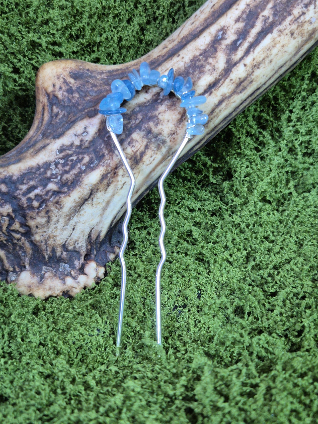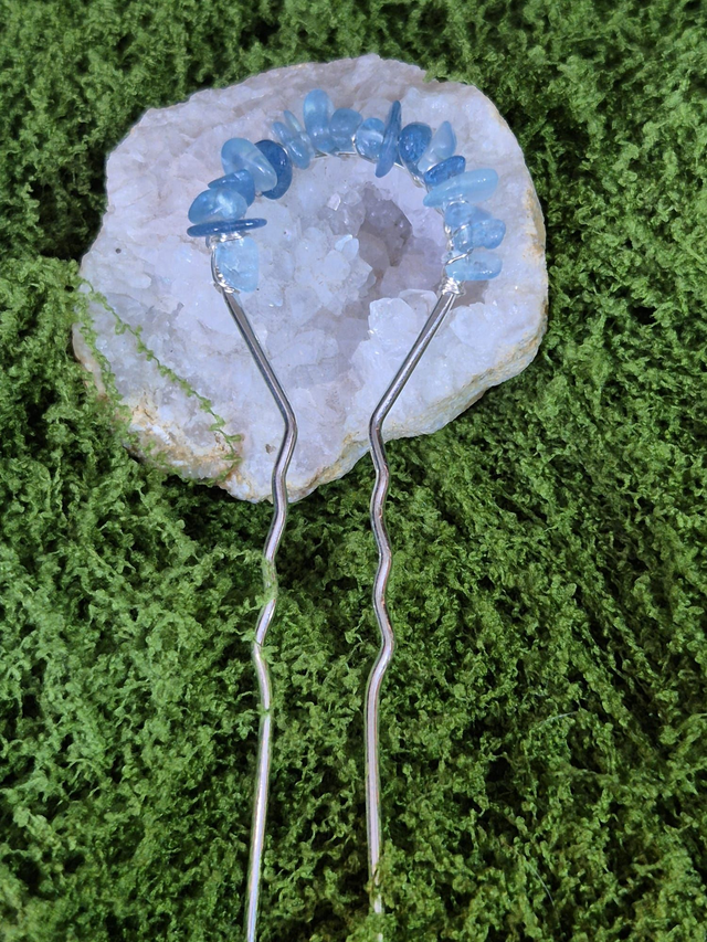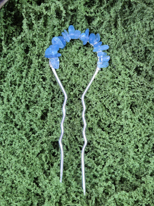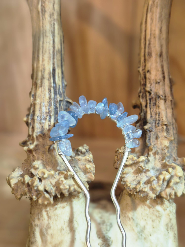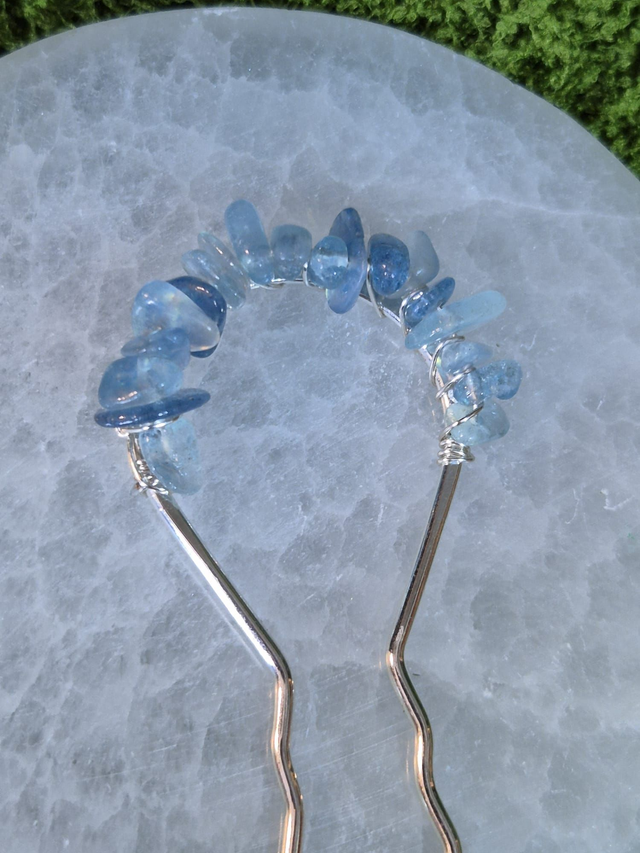 Sa base en acier inoxydable assure robustesse et élégance, tandis que les pierres d’Aigue‑Marine, aux teintes bleues claires et irrégulières, sont délicatement tissées à la main avec du fil de cuivre. Chaque pic est une pièce unique, transformant ton chignon en véritable bijou de cheveux exclusif.