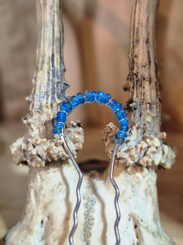 Sa base en acier inoxydable assure robustesse et finesse. Les pierres bleues d’Apatite, aux formes irrégulières, sont tissées à la main avec du fil de cuivre. Chaque pic est une pièce unique, transformant ton chignon en véritable bijou de cheveux exclusif.