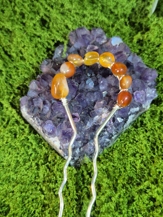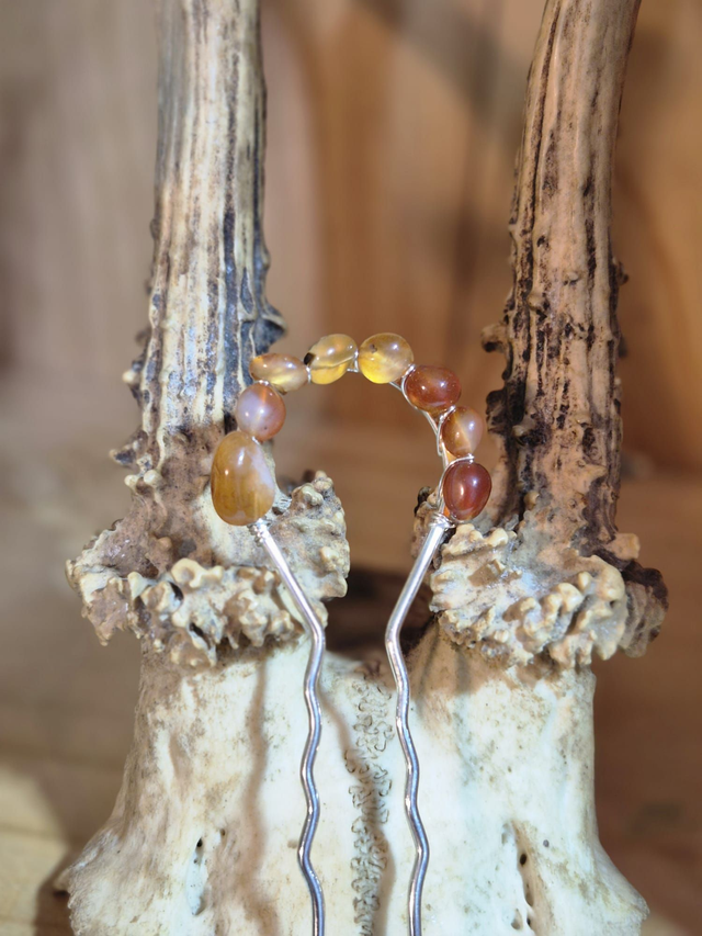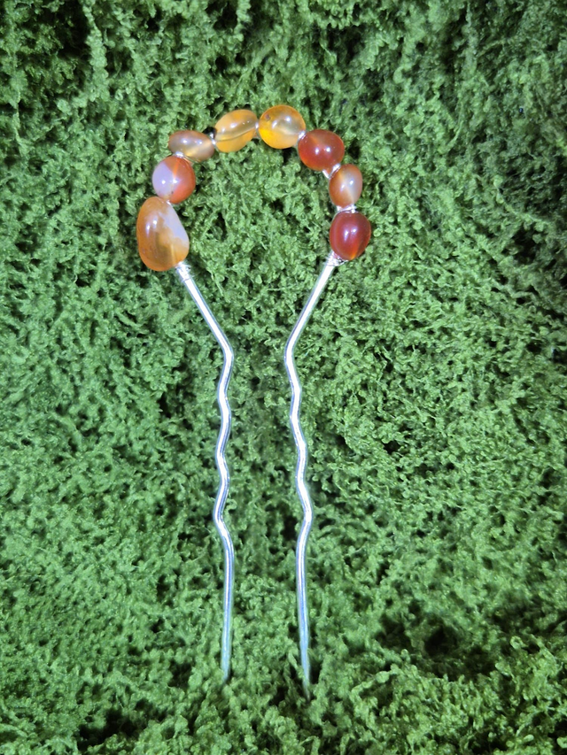 Sa base en acier inoxydable assure solidité et finesse, tandis que les pierres de Cornaline, aux nuances orangées et rouges, sont tissées à la main avec du fil de cuivre. Chaque pic est une pièce unique, transformant ton chignon en véritable bijou de cheveux exclusif.