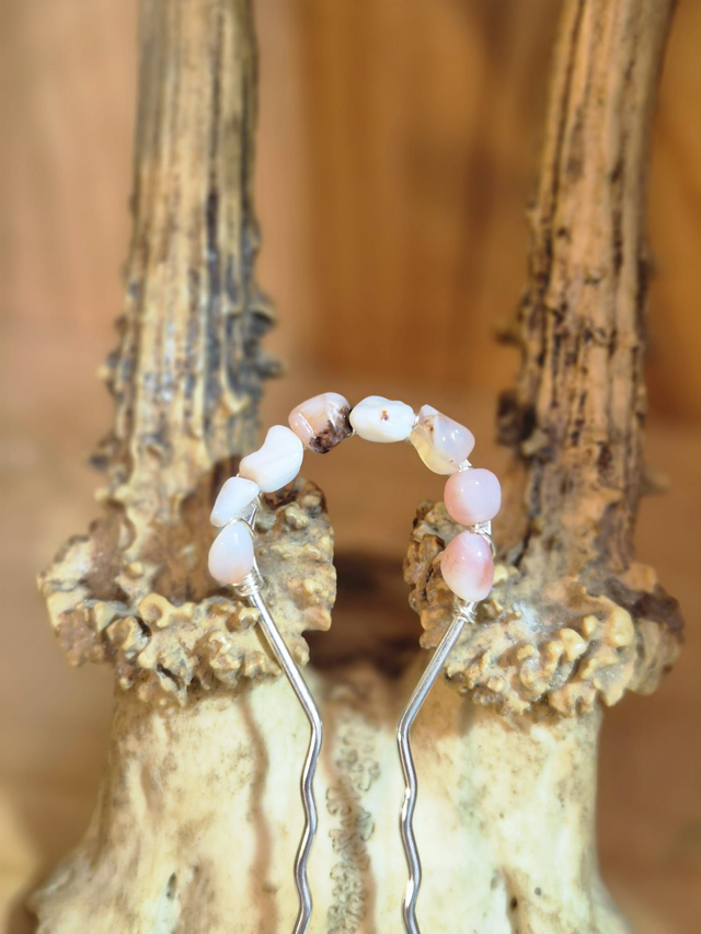 Sa base en acier inoxydable assure solidité et finesse, tandis que les pierres d’Opale Rose, aux nuances délicates et lumineuses, sont tissées à la main avec du fil de cuivre. Chaque pic est une pièce unique, transformant ton chignon en véritable bijou de cheveux exclusif.