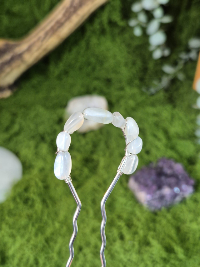 ✨ La Péristérite est réputée pour favoriser l’intuition, la clarté et l’harmonie intérieure, apportant une énergie lumineuse et inspirante à tes coiffures.