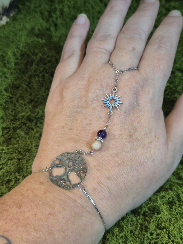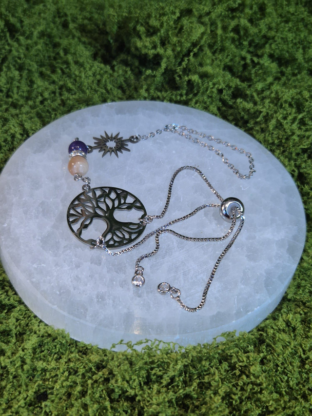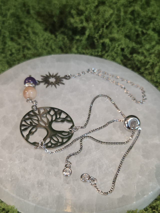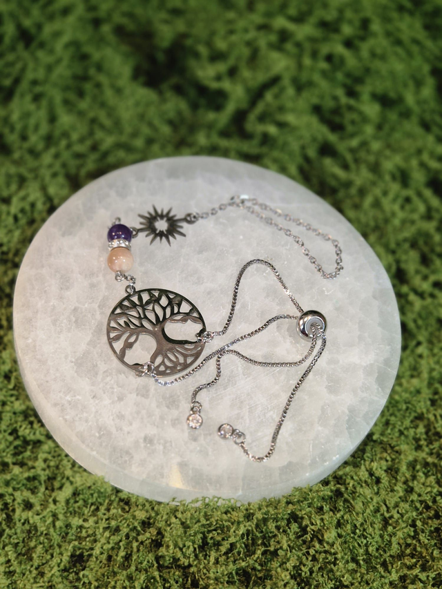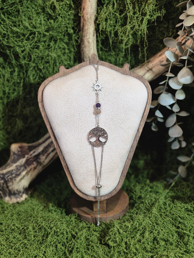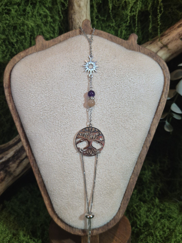 Il est relié à un médaillon représentant l’arbre de vie, symbole d’ancrage, de croissance et de lien entre les mondes.