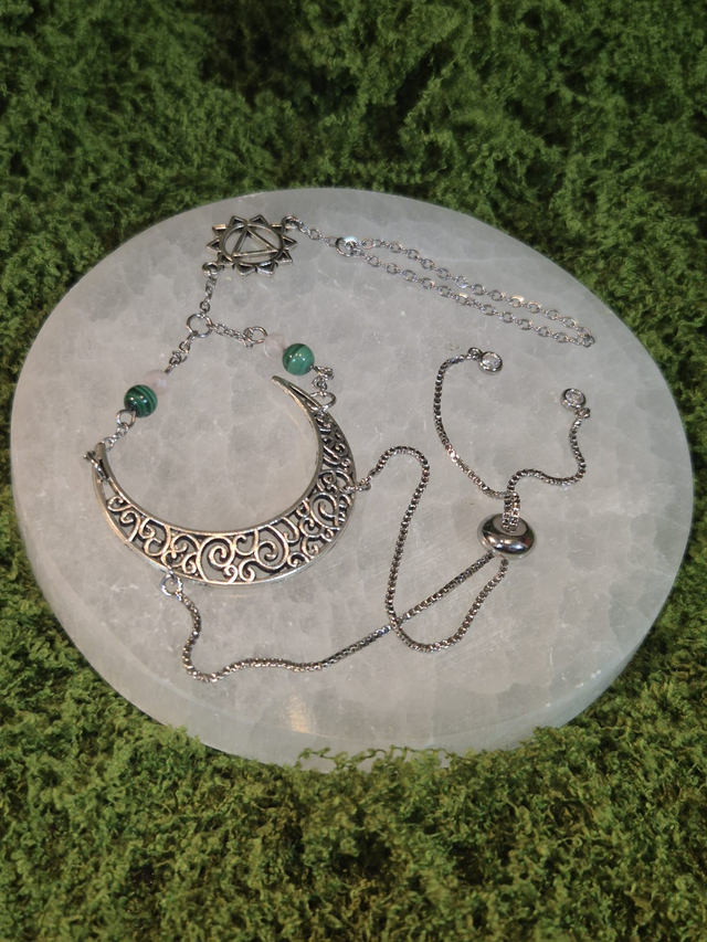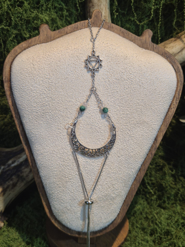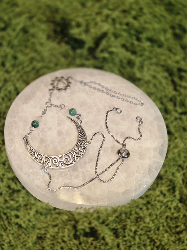 En son centre, un croissant de lune argenté aux volutes délicates incarne les cycles intérieurs, la transformation et l’intuition.