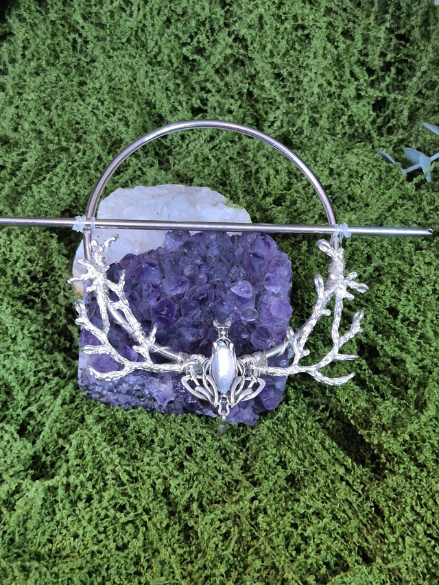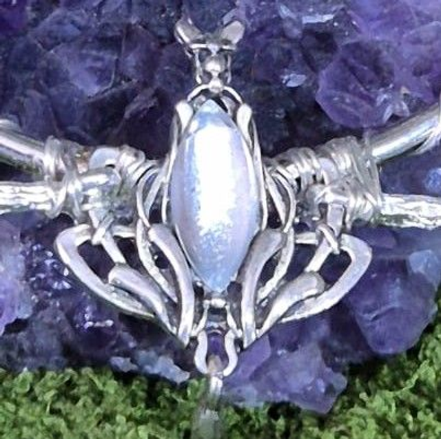 En son centre, une pierre de verre irisé capte la lumière avec des reflets changeants, évoquant les lueurs d’une lune voilée.