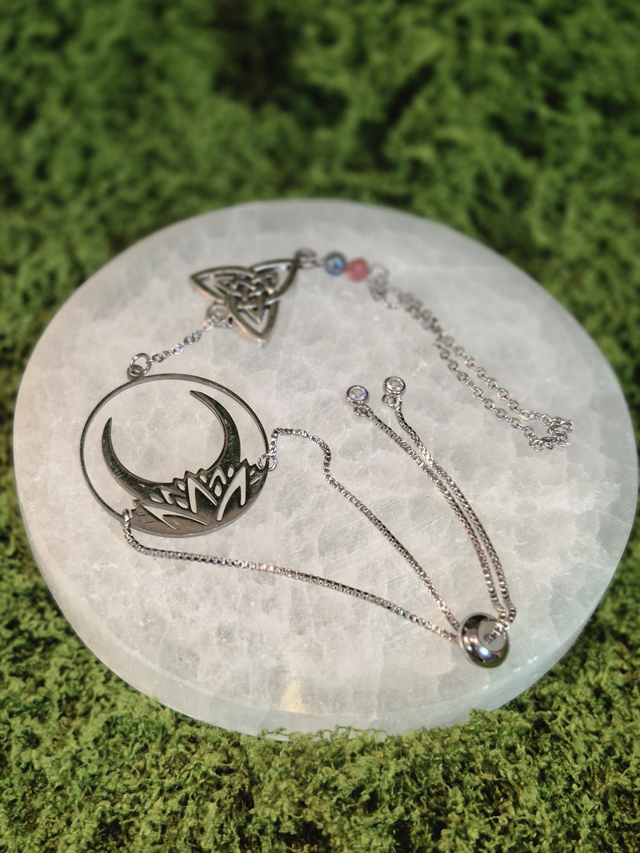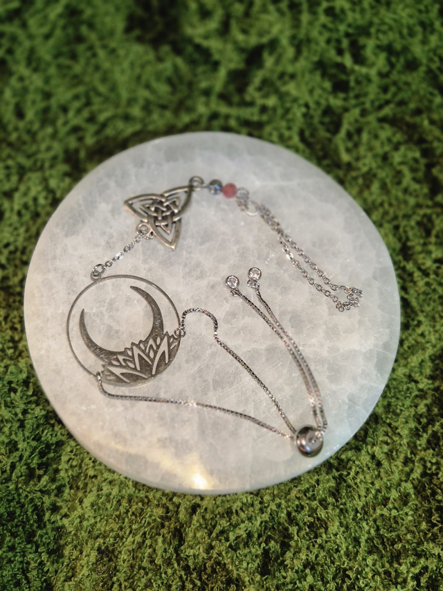 Il est relié à un médaillon lunaire stylisé, évoquant les cycles féminins et l’intuition profonde.