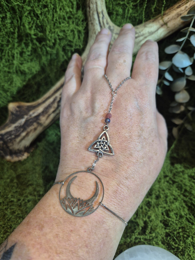 Monté sur une chaîne en acier inoxydable, ce bijou épouse la main avec élégance et intention.